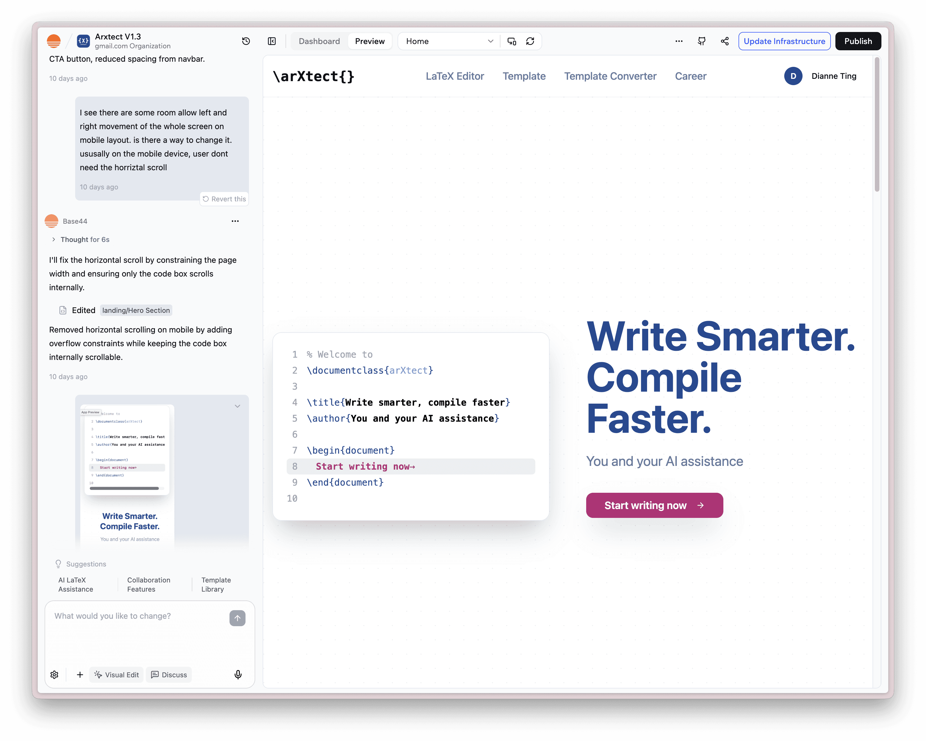 arXtect is a next-generation LaTeX editor powered by AI and WebAssembly, designed to solve the slow compilation speeds of traditional tools like Overleaf. However, its initial branding was overly technical and dense, failing to communicate its core value: simplicity. Furthermore, the core engineering team needed to focus on the complex backend logic, leaving them with little bandwidth for frontend web development.